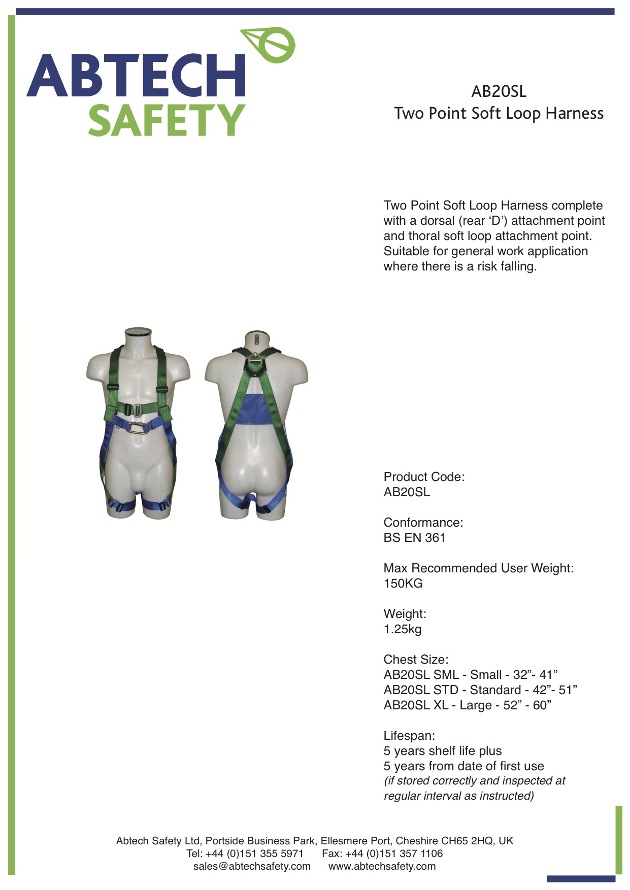 The AB20SL is in full compliance with modern standard BS EN 361. So you know you're in safe hands with Abtech safety gear.